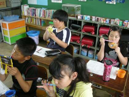 プラークテスター錠を使って歯の汚れを確認しました。その後,正しい歯磨きの仕方について学習しました。子どもたちからは,「今度からは歯の裏まで磨こう」「歯と歯の間も磨かなあかん」といった声が聞かれました。いつもの歯磨きを見直すきっかけとなったようです。