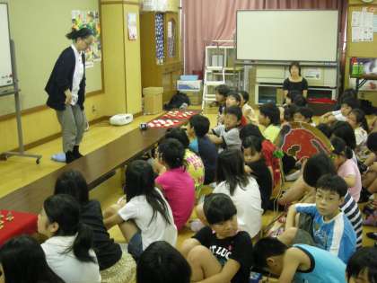 日本の伝統文化について学習しました。講師として彩色絵師の林美木子さんに来ていただきました。現在のかるたのはじまりでもある貝合わせ(蛤の内側に絵が描いてあり,同じ絵を合わせる)について詳しく教えていただきました。子どもたちは,きれいな貝を手に貝合わせに夢中になっていました。