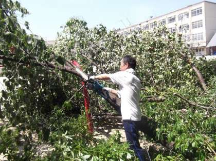 8月9日・10日の2日間,真夏の青空のもと,校庭周辺の樹木を剪定しました。新品のチェーンソーで稲垣教頭先生がプロ顔負けの職人技で剪定していきました。樹木に生息する虫たち(主にカメムシ)もびっくりしてあわてて他の枝へ飛び移っていました。