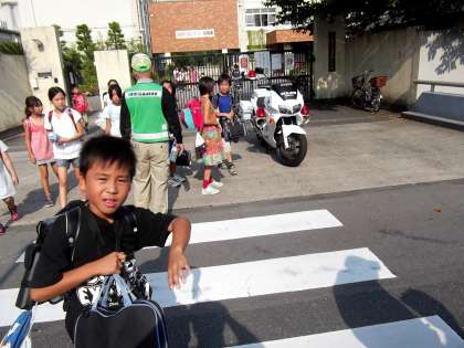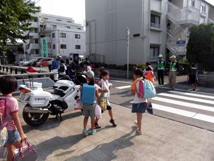 下校時には,毎日地域の各種団体の方々が交代で立って下さり児童の安全を見守ってくださっています。今日は西京署からも来ていただきました。本当にいつもありがとうございます。