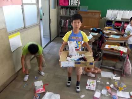 いろいろな材料を用意しみんなで考えを出し合って,たのしくあそべる物を作っています。一見ごみだらけに見えますが,実は貴重な材料なのです。あそべる日が楽しみですね。