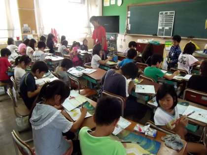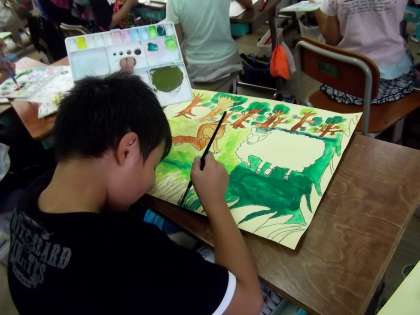 現在お話の絵に取り組んでいます。お話を聞いて自分で想像をふくらませ,絵に表わしています。