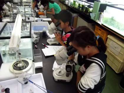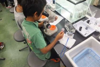 身近な淡水にすむスジエビ。体が透明であるという特徴を生かして,胃や心臓を観察し,生命の神秘に迫りました。