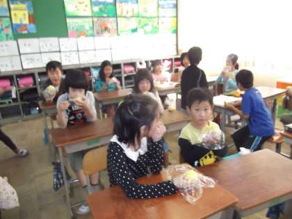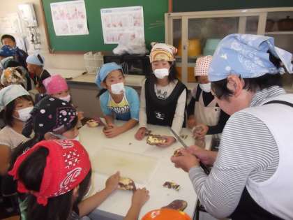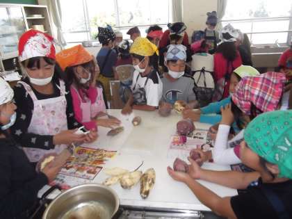 総合の学習で育てたサツマイモを使って,茶巾しぼりを作りました。川岡東女性会のみなさんにお手伝いをしていただきながら,サツマイモの皮をむいたり,切ったり,つぶしたり,楽しく活動することができました。ほんのり甘くやさしい味で,おいしくいただきました。