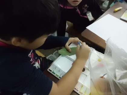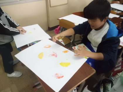 牛ケ瀬公園や運動場で見つけた木の葉を使って,版画の背景を作りました。