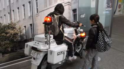 京都府警察本部では、白バイに乗ったり、京府警の活動の様子を見たり、総合指令センターを見学したりしました。
