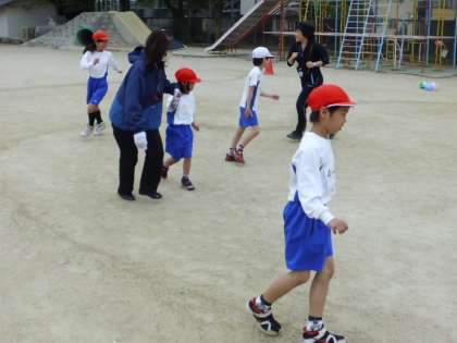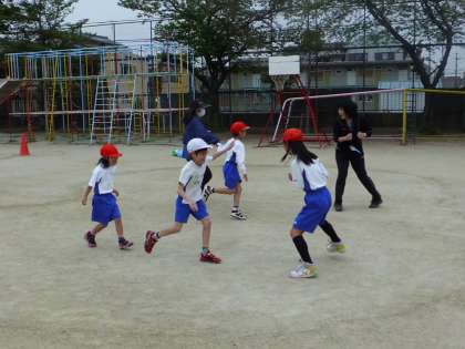 体育の時間にみんなでおにごっこをしました。きめられた場所の中で,タッチされないように逃げ回っています。先生も息をきらしながら・・・みんなで楽しく活動しました。