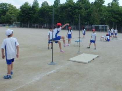 体育で走り高跳びに取り組んでいます。ふみ切りをしっかり合わせてジャンプするのが少し難しいです。また,バーにあたる恐怖心も克服しないといけません。これから練習を重ねて記録に挑戦していきます。