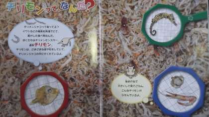 チリメンジャコをよ〜く見てみると,小さな魚や貝など,いろいろな生き物がかくれているそうです。