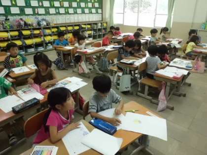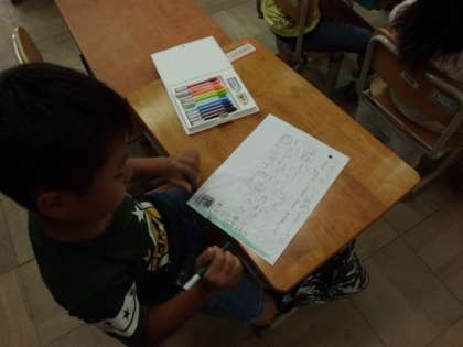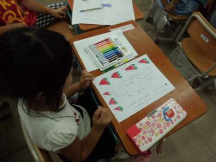 自分のすきなものをしょうかいするために文を書いています。みかんが好きな人や,いちごのすきな人・・・理由をしっかり書いたり,イラストを書いたりしていました。発表もがんばって下さいね。