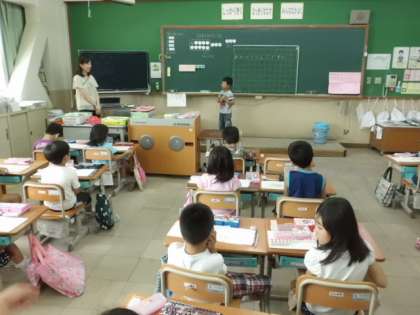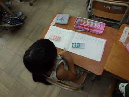 数図ブロックを動かして,たし算の学習をしています。10を越えて,20までのたし算に挑戦しています。みんながんばって下さいね。