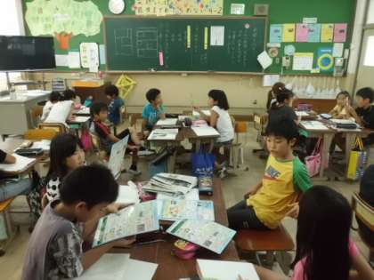 国語で,全校のみんなに読んでもらう新聞づくりをします。今日は「編集会議」です。記事の内容や分量について話し合っています。新聞のできあがりが楽しみですね。