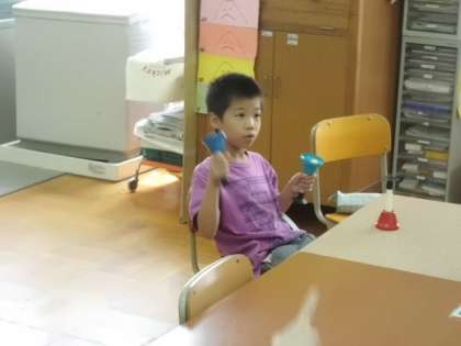 ハンドベルで音の役割を決めて,「かえるのうた」を演奏しました。難しかったけれど,練習を繰り返すととてもじょうずに演奏できました。みんな「やったぁー」と大喜びです。