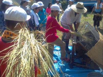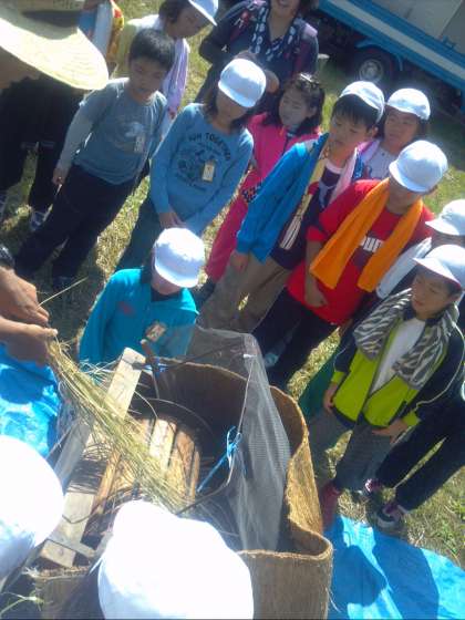 今は博物館などでしか見られないものを使って、脱穀の体験をしています。