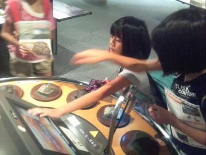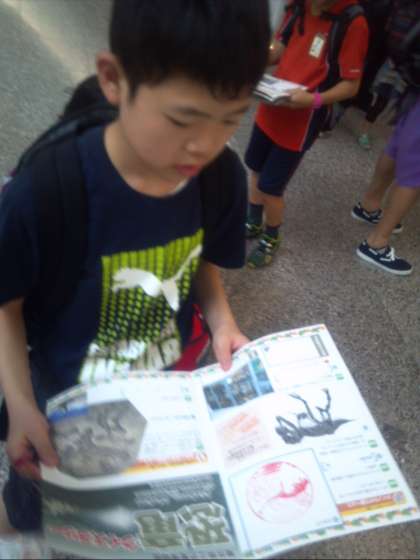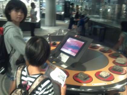 博物館内をまわり,夢中になって恐竜について調べたり,体験したりしています。