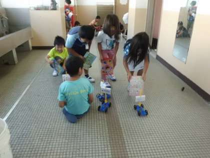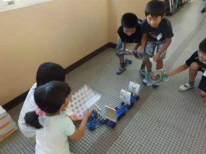 風の力を使って動く自動車を作りました。下敷きなどであおいで走らせるととても楽しいです。でも,どうして走るのか・・・風の力と速さの関係は・・・???