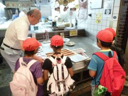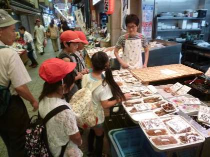 今日は,社会見学で錦市場と京都駅方面へ行きました。最初に行った錦市場では新鮮な食材が並んだ,にぎやかな商店街の様子を見学しました。商店の方々に説明してもらったり,質問したりしながら商店の工夫やひみつを調べていきました。