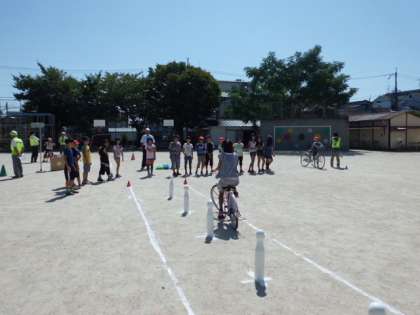 子どもたちも,実際に自転車に乗って体験しました。正しい乗り方で走行できているかチェックしていただいたり,技術走行(ジグザグ走行・おそ乗りなど)を体験したりしました。今日,学習したことを生かして交通安全につとめていきたいと思います。
