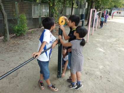 巻尺を使って学校内のいろいろな物の長さを測りました。巻尺を使うと丸い物や曲がっている物の長さも測ることができるのでとても便利ですね。