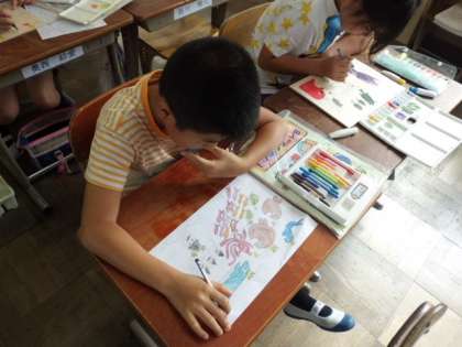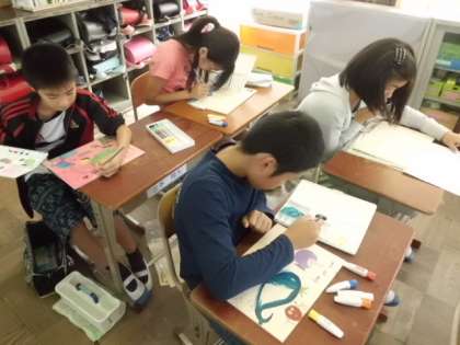 自分の思い描いたデザインを板に描き,着色しています。その後は,糸のこぎりでバラバラに・・・さあ,何ピースのパズルにするのかな?
