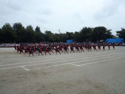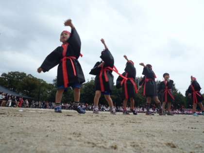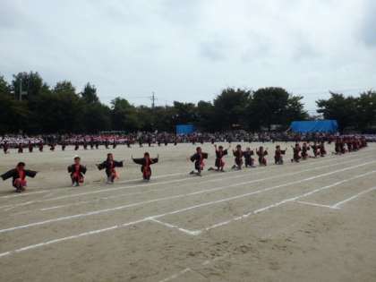 「やーっ」のかけ声とともに2年生の勇ましい,演技が始まりました。キレ味抜群の踊りで,川岡東に炎が広がるかのごとくでした。