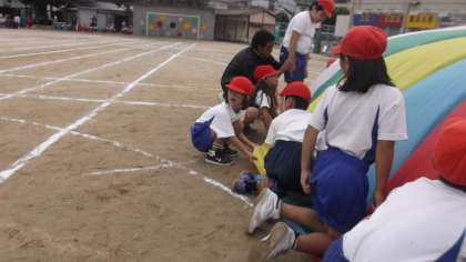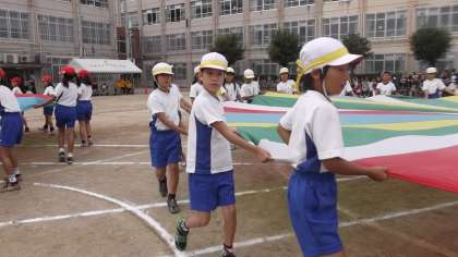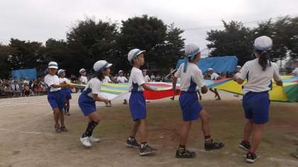 3年生となかよし学級が合同で演技をしました。リズムに乗って,まるい布を上下にふって・・・
