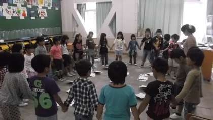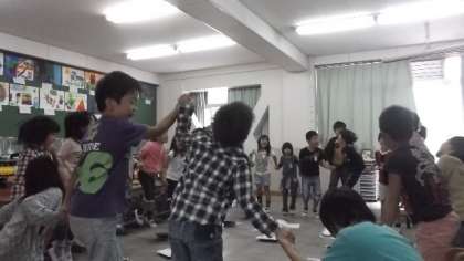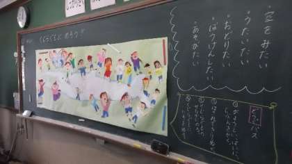 黒板の模造紙にはり出された大きなクジラ雲に,クラスみんなの絵を乗せました。お話と同じように,みんなで手をつないで「天までとどけ1・2・3」とジャンプしていました。みんな気持ちの中では,完全に『くじらぐも』に飛び乗っていました。