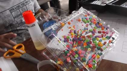 廃材を組み合わせたりビーズをつけたりして,一人ひとり違うものができあがっていく過程は見ていても楽しいです。