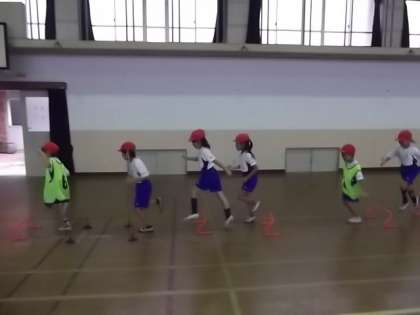 グループになって,先頭の人のまねをしながら,先頭の人が意のままに選んだコースを一定時間走ります。手を回したり,スキップをしたり,みんなでとても楽しそうにしていました。