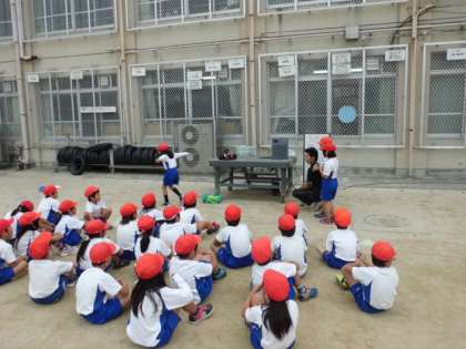 運動場いっぱいにつくったコースをグループで同じ動きをしながら走りました。いろいろユニークな走り方や動きを考えて走っていました。走ることはしんどいというイメージは全然なくみんなとても楽しそうでした。楽しかった動きをみんなで紹介し合っていました。