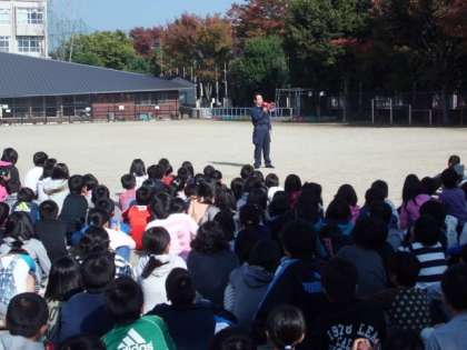2校時に不審者侵入を想定して避難訓練をしました。西京警察署の生活安全課の方に犯人役をしてもらい,教職員で取り押さえました。犯人確保を確認してから,全校児童が校庭に避難しました。子どもたちは約束事をしっかり守って行動できました。教職員も不審者に対峙する時のポイントを教えていただきました。