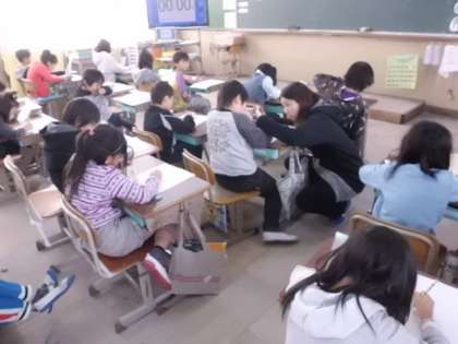 はんがの下絵を書いていました。鏡で自分の顔をうつして,目や鼻などとても細かく観察して書いていました。歯みがきのポーズをとって歯ブラシや口の細かいところもよくみて書いていました。