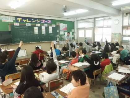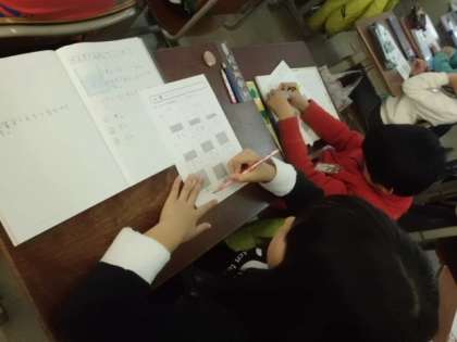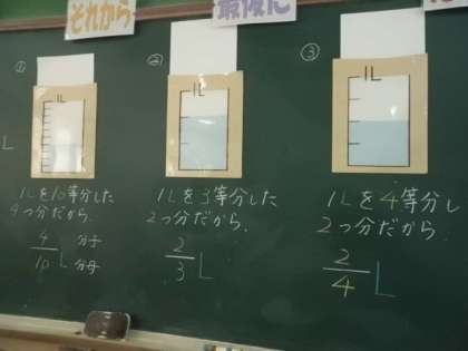 分数の学習では,水1Lを「いくつに分けたいくつ分」という考え方になれるために,くり返し学習していました。みんなしっかり理解し,どんどん問題を解いていました。