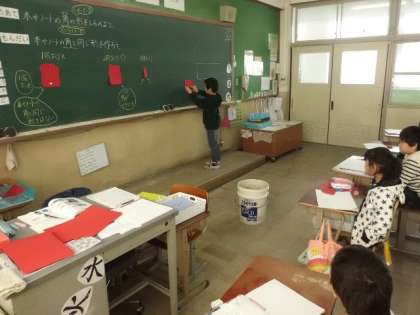 まわりがグニャグニャに切られた紙で,どのようにすれば角がつくれるか,四角形になるかを考えて学習していました。自分の考えた方法をみんなに一生けんめい説明していました。