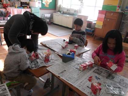 小さな巨匠展に向けての制作をしました。今日のめあては,『ももたろうのけらいをつくろう』です。牛乳パックをつかって,すきな動物を作りました。ライオン・さる・きりんなど,本当のお話にはでてこない動物も作りました。