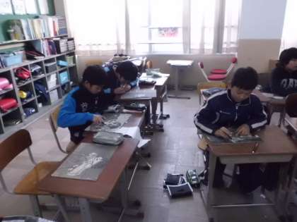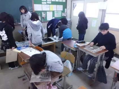 版画に取り組んできましたが,彫り上がった児童が印刷をしていました。白黒のバランスをしっかり考えて取り組んできた跡が見られ,よい作品ができていました。2月の作品展をお楽しみにしておいて下さい。