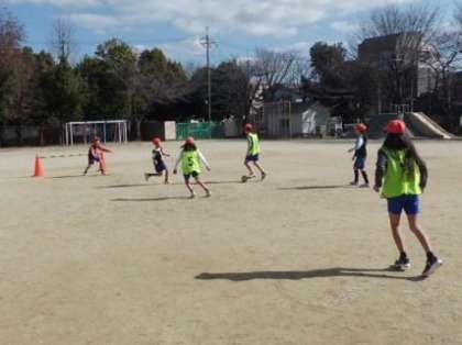 青空の下,ボールを追いかけて力いっぱいプレーしていました。ドリブルもパスもなかなか上手です。男女ともチームで協力して仲よく活動していました。
