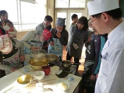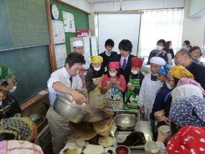 本日,日本料理アカデミー会員の田中信行氏(京料理・鶴清)井上勝宏氏(京料理・井政)辰馬雅子氏(京料理・せんしょう)に食育の学習をしていただきました。こんぶとかつおぶしから本格的なだしをとってお吸い物を作りました。