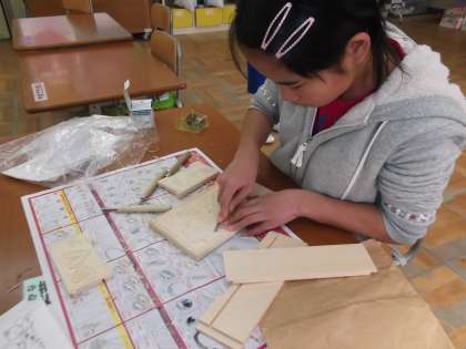 図工の時間に卒業制作でオルゴールを作っています。デザインを考えて,板に下書きをし,彫刻刀で彫り進めています。安全に学習ができるよう,彫刻刀の持ち方に十分注意し,慎重に彫っています。小学校時代の思い出がたくさん詰まった作品に仕上がりそうですね。