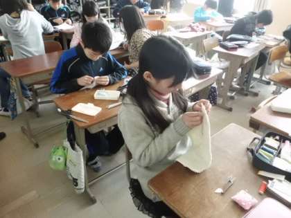 卒業を目前にして,在校生にプレゼントするためのぞうきんをぬっています。