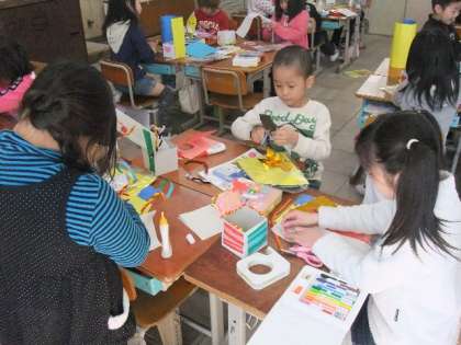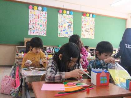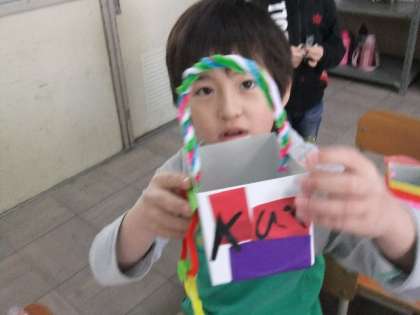 ストローから息を吹き込むと袋が広がる仕組みを利用した作品を作っています。みんな袋が広がる動きからいろいろとイメージしていました。ビックリばこや鬼の口からベロが飛び出してくるなど・・・できあがりが楽しみです。