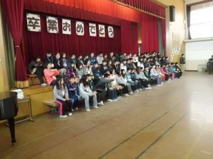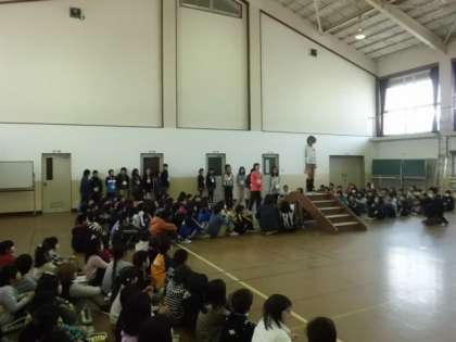 本日「6年生を送る会」がありました。1年生から5年生までの児童の拍手に迎えられ,入場しました。段の上で一人一人名前を呼んでもらい,はずかしそうに返事をする子や,パフォーマンスをして会場を盛り上げる子もいました。