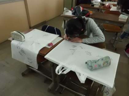 図工の作品袋に,みんなで寄せ書きをしています。卒業間近のワンシーンです。いつまでもすてきな仲間でいて下さいね・・・・