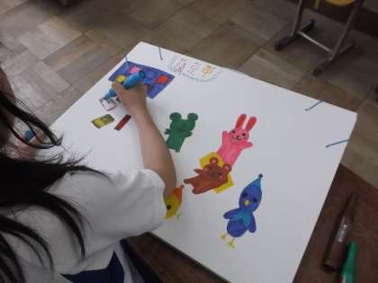 図工の作品を持ち帰るための作品バックに思い思いの絵をかきました。今年もたくさんの作品に取り組みました。家に帰ってゆっくり見なおして1年間を振り返って下さいね。