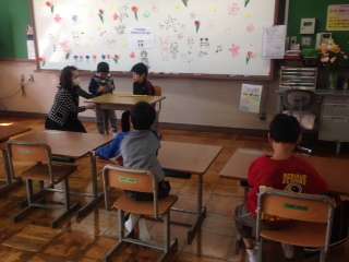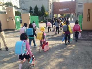 元気に登校した1年生。靴の履き替えやランドセルの片付け方など,まず学校に来てから行うことを先生の話を聞きながら上手にしていました。