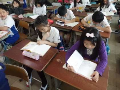 今日,先生から読書ノートを配ってもらいました。1年間で100冊をめざしてがんばっていきます。いきなり何冊もの本を読破し,先生にチェックを受けている児童もいました。みんながんばって読みましょうね。
