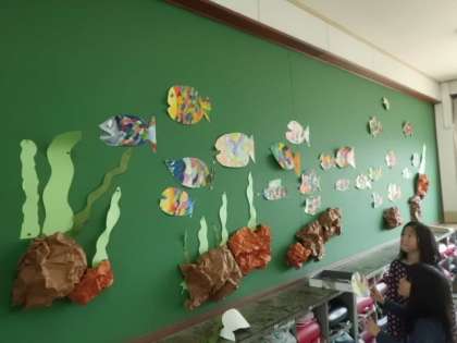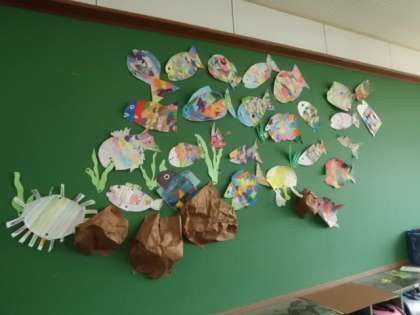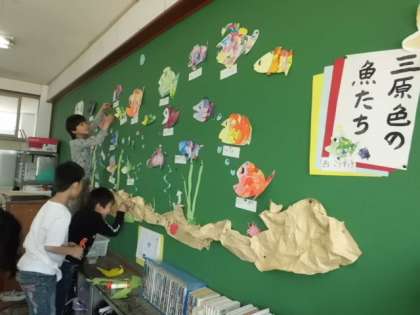 三原色で色を作り,思い思いのきれいな魚を描いて,教室の掲示板に泳がせました。どの教室もまるで水族館になったような感じです。