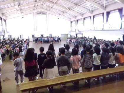 今日の3時間目に1年生をむかえる会がありました。6年生と手をつないで入場してきた1年生は,段の上で1人ずつ名前を呼ばれ少しはずかしそうにしながらも「ハイ!」と返事をしました。最初にみんなで児童会の歌を元気いっぱい歌いました。