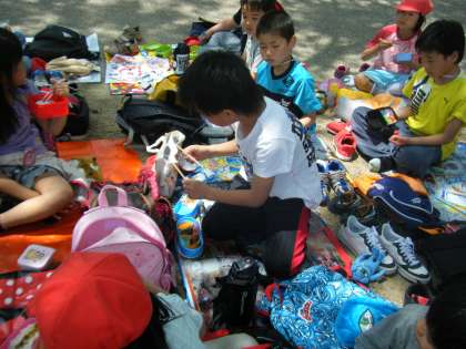 おもいっきり遊んだらお腹が減りました。みんなお待ちかねのお弁当です。お家の方が朝早く起きて作ってくださった,愛情たっぷりのお弁当を子どもたちは美味しそうに頬張っていました。お忙しい中,お弁当ありがとうございました。