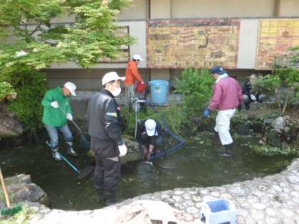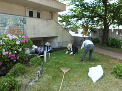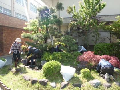 5月4日(日)本日,川岡東学区各種団体及びPTA本部,総勢17名の方々が早朝より川岡東庭園の清掃をして下さいました。植え木の剪定や草刈り,池の大掃除などお休みの中本当にありがとうございました。
